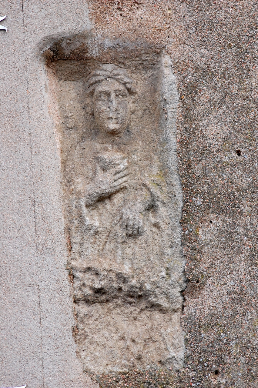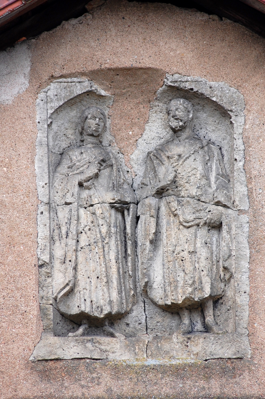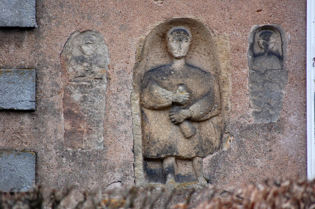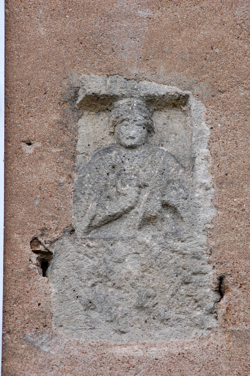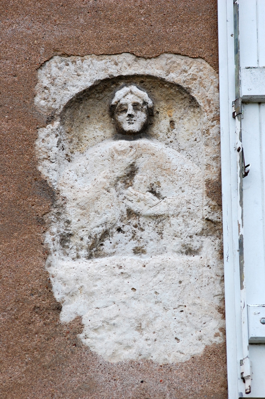 - Découverte avant 1848, cette stèle en grès mutilée, d’hauteur 1.50m, représentant un homme et une femme drapés, tenant chacun dans la main droite un objet allongé mal identifié. (L’abbé Devoucoux y voyait une sorte de cornet à liqueur ou a parfum. Inscription en haut à gauche. NO