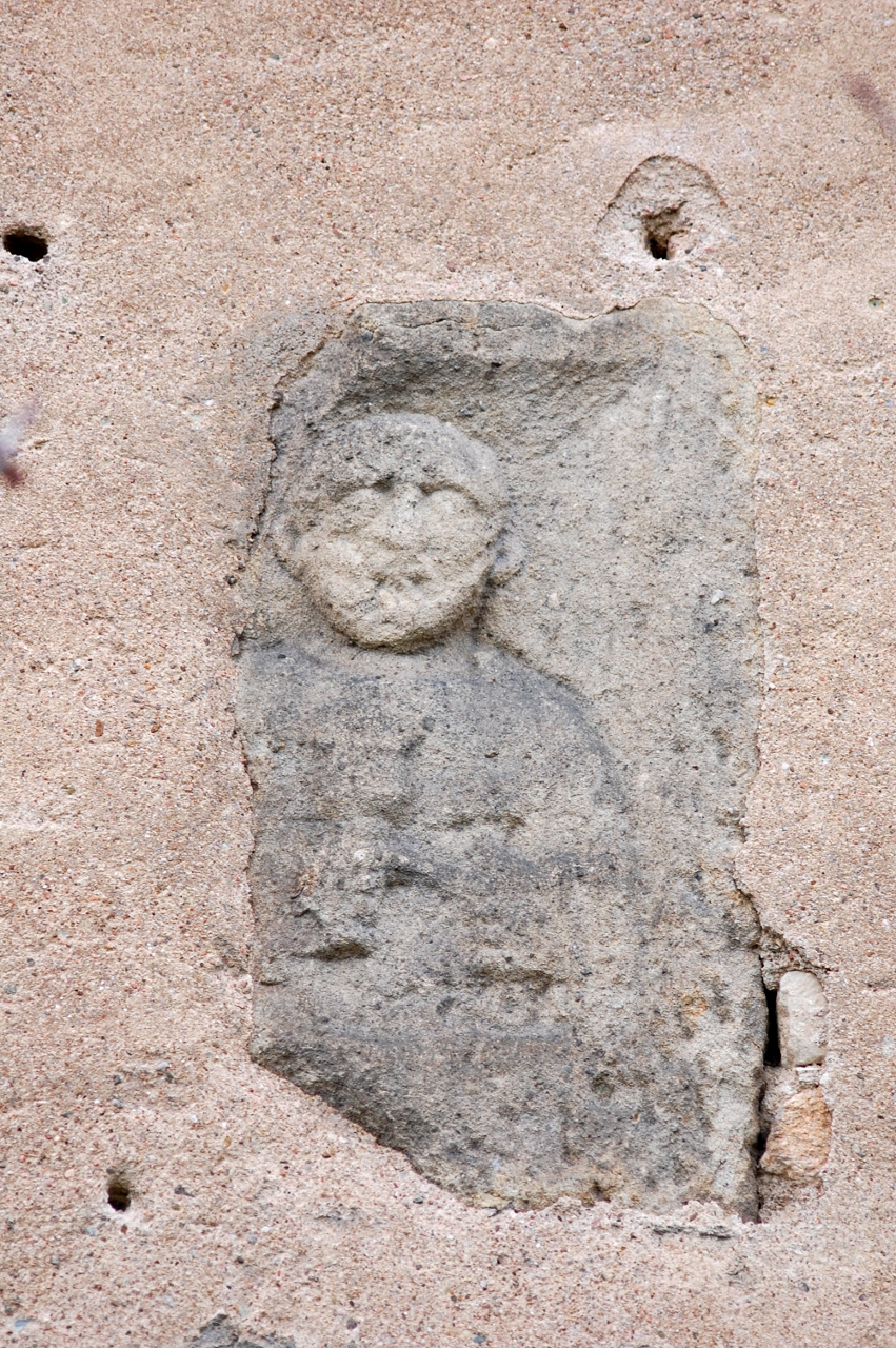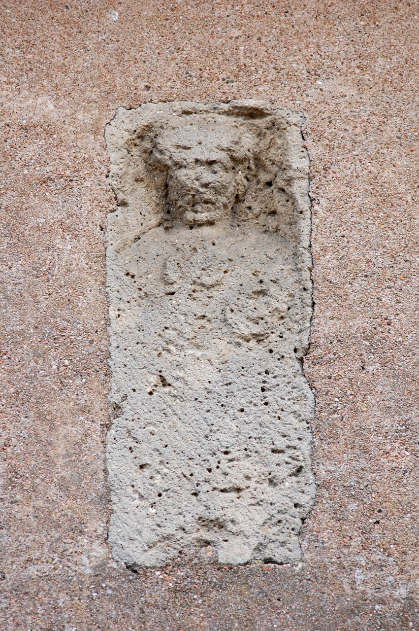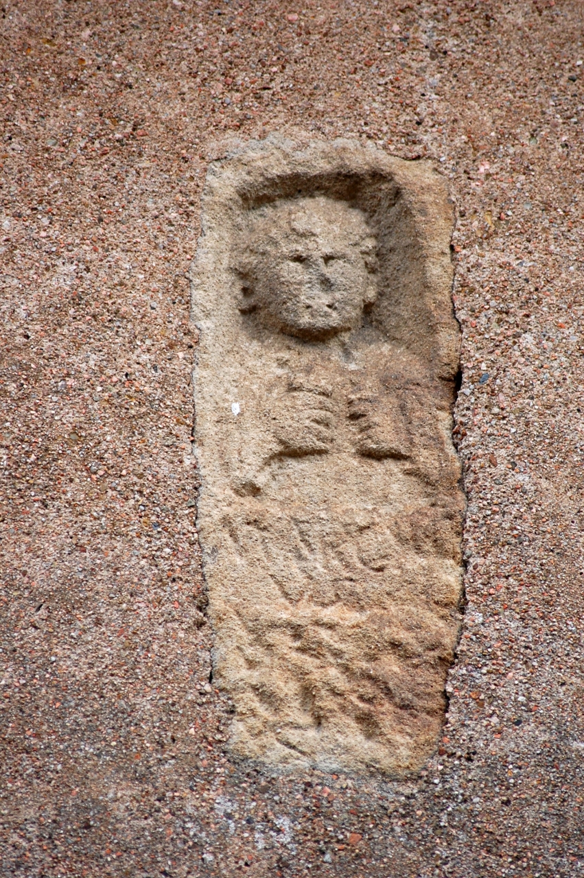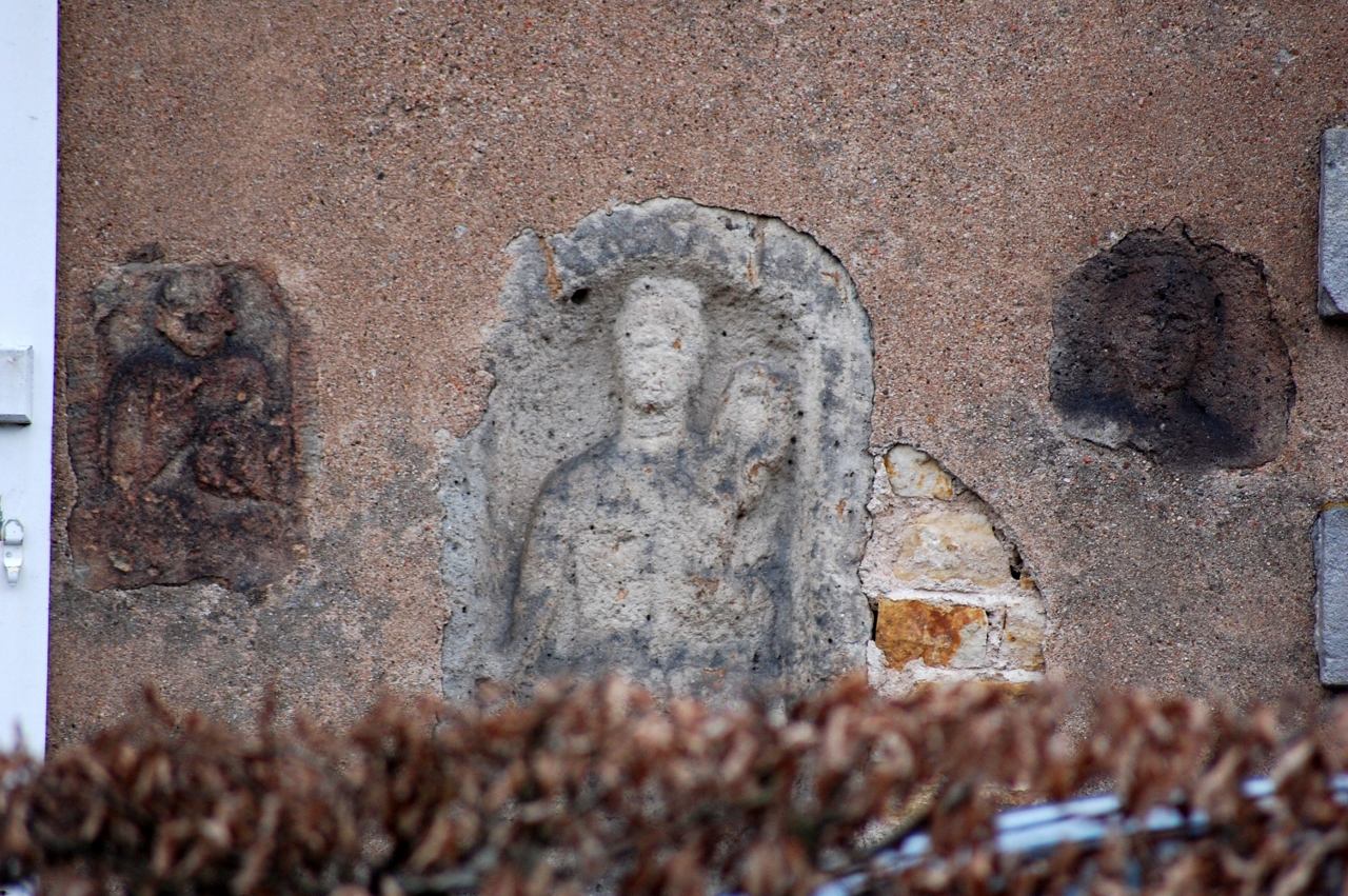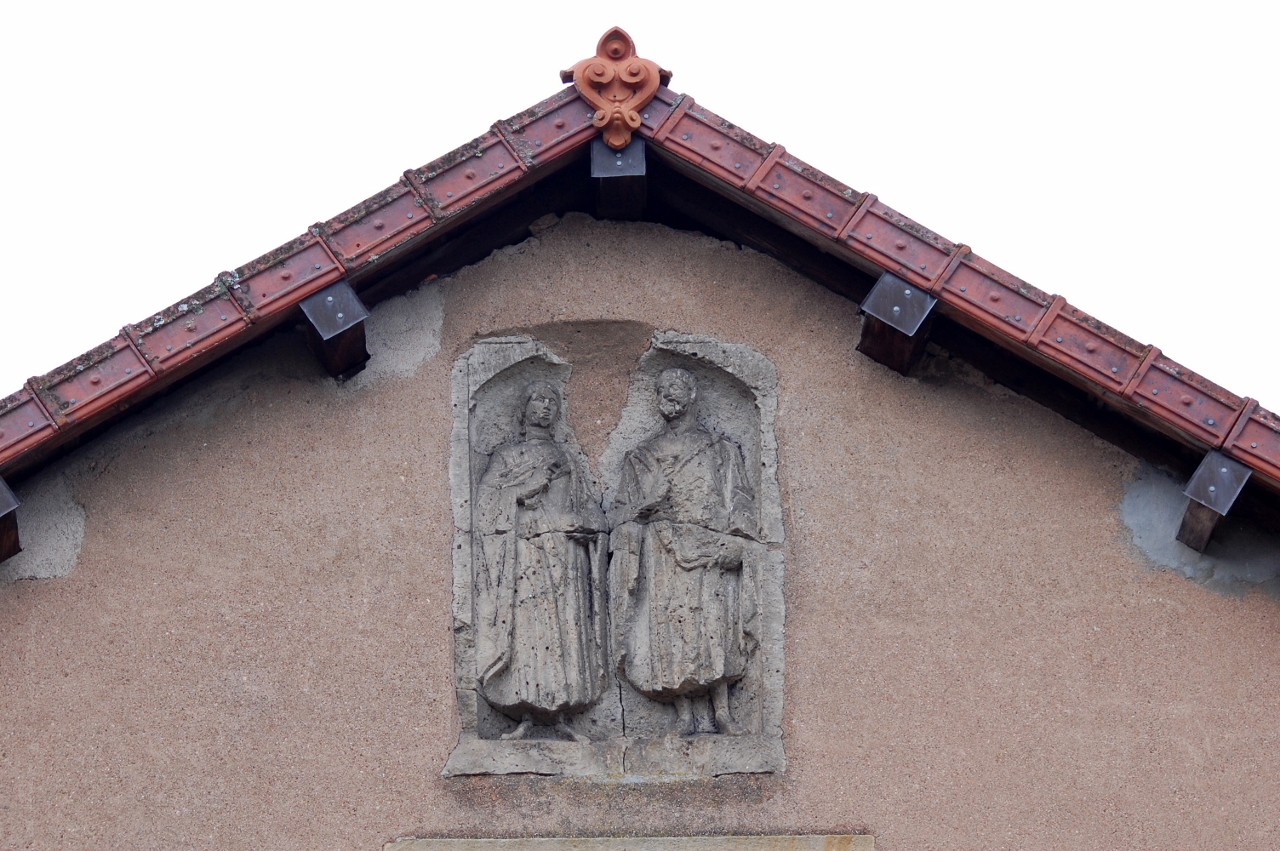 - Découverte avant 1848, cette stèle en grès mutilée, d’hauteur 1.50m, représentant un homme et une femme drapés, tenant chacun dans la main droite un objet allongé mal identifié. (L’abbé Devoucoux y voyait une sorte de cornet à liqueur ou a parfum. Inscription en haut à gauche. NO