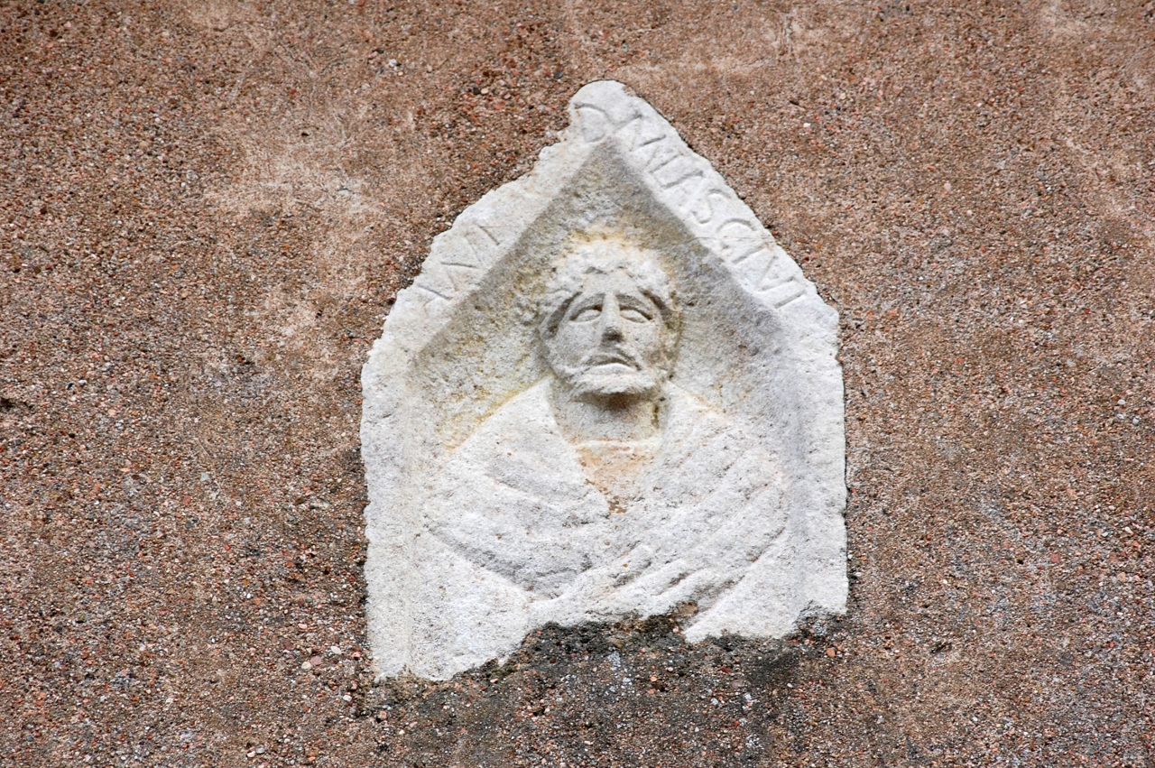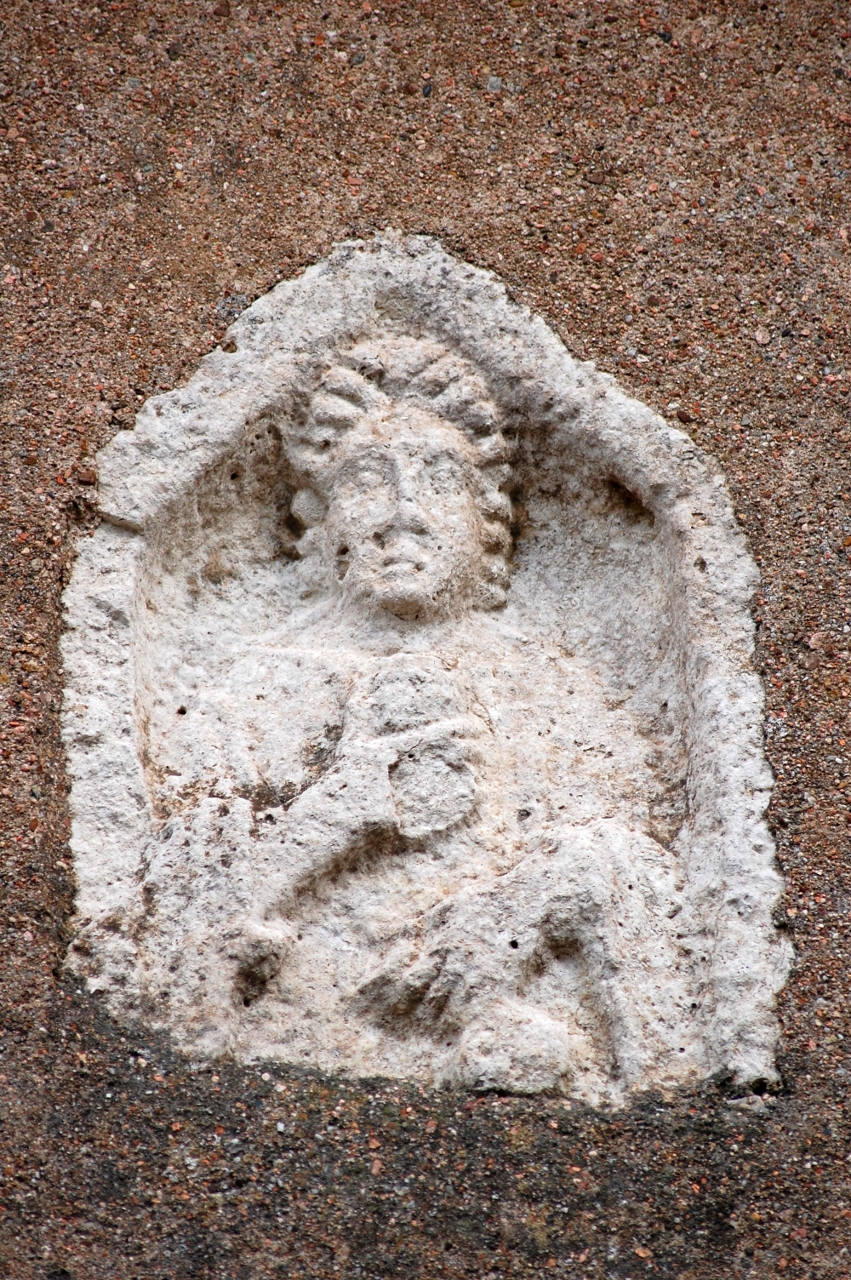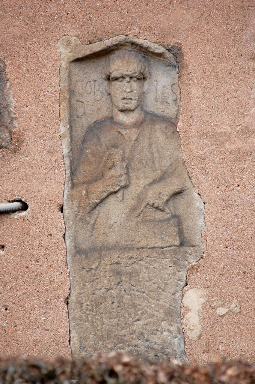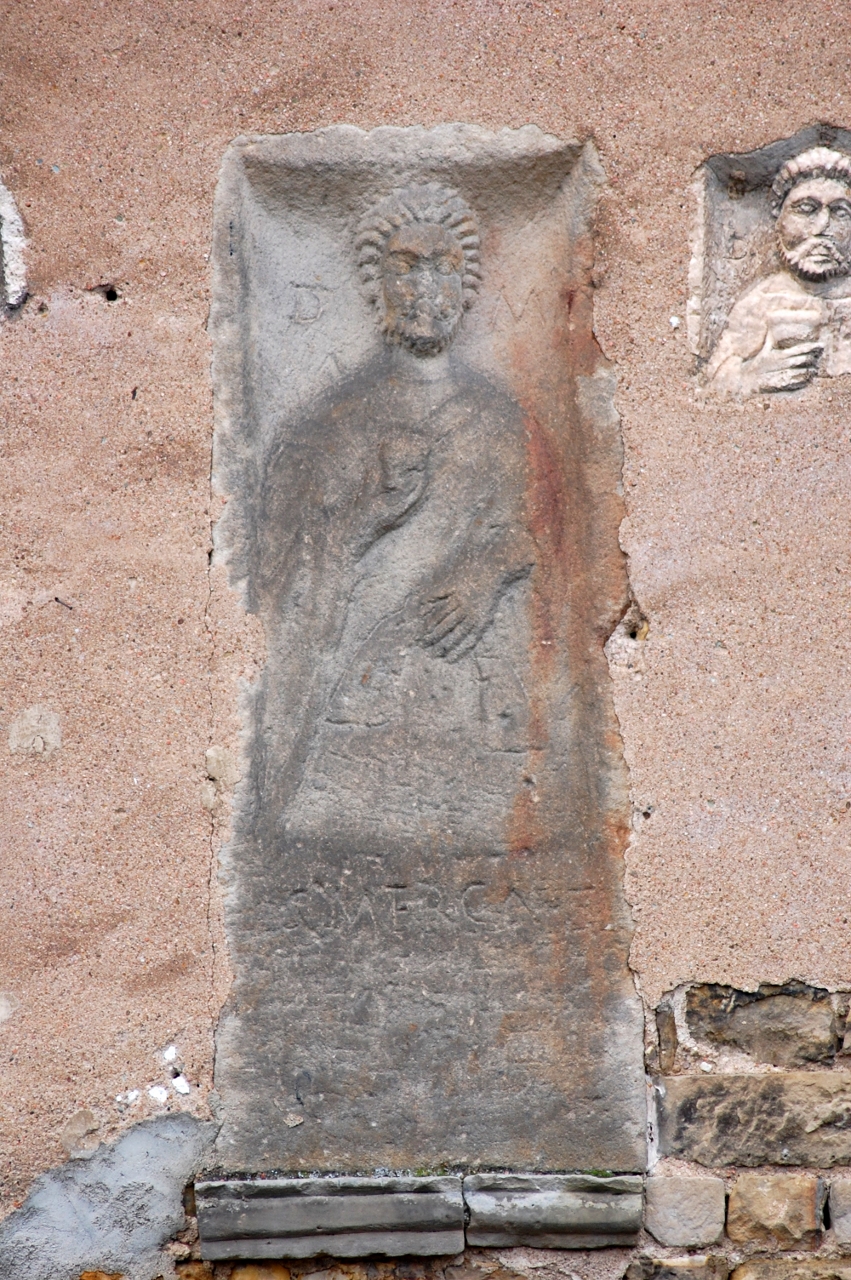 - Découverte avant 1848, cette stèle en grès d’une hauteur de 1.40m et d’une largeur 0.60m, représentant dans une niche rectangulaire, un personnage tenant dans sa main droite un poculum et de la gauche un objet qui semble être une mappa. Inscription : D(is) M(anibus) SMERCAT.
