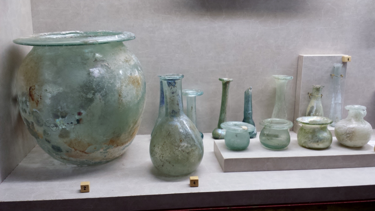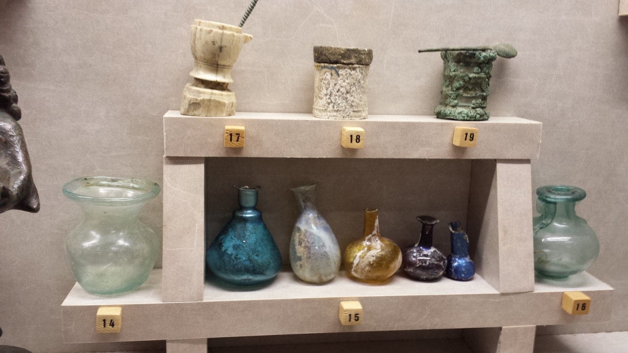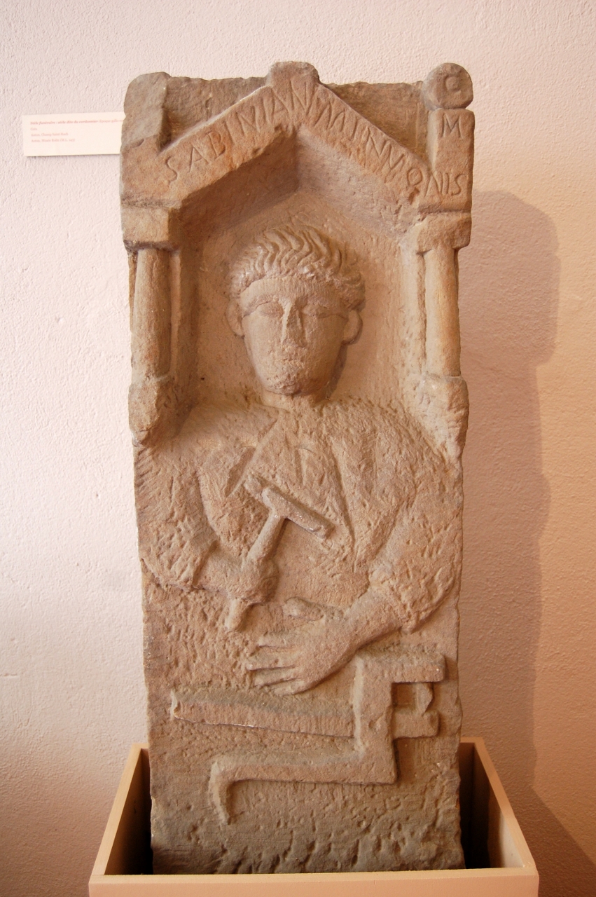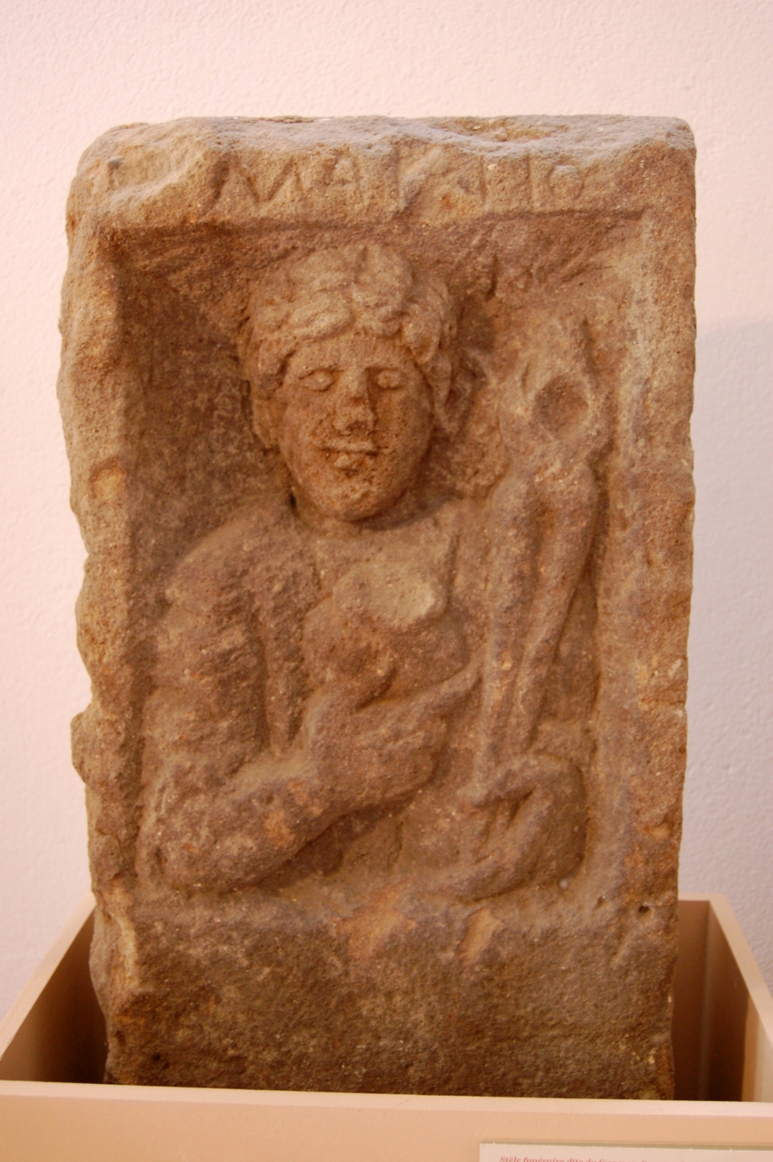 guilles et des fuseaux ainsi que des pommeaux d’épée ; en bronze on a une quantité de petits objets tels que des statuettes de petits animaux ; en verre on a plusieurs ampoules qui servaient à conserver les parfums ou des condiments, on a également de la vaisselle avec notamment une bouteille en forme de poisson ; on a aussi quelques intailles, des objets en pâte de verre, des cachets de cire ; en céramique on a une grande quantité d’objets au nom de Pistillus, célèbre potier d’Augustodunum qui avait pour spécialité de signer ses moules : ses moules servant à produire en série des représentations de divinités pour les autels domestiques des populations les plus pauvres.