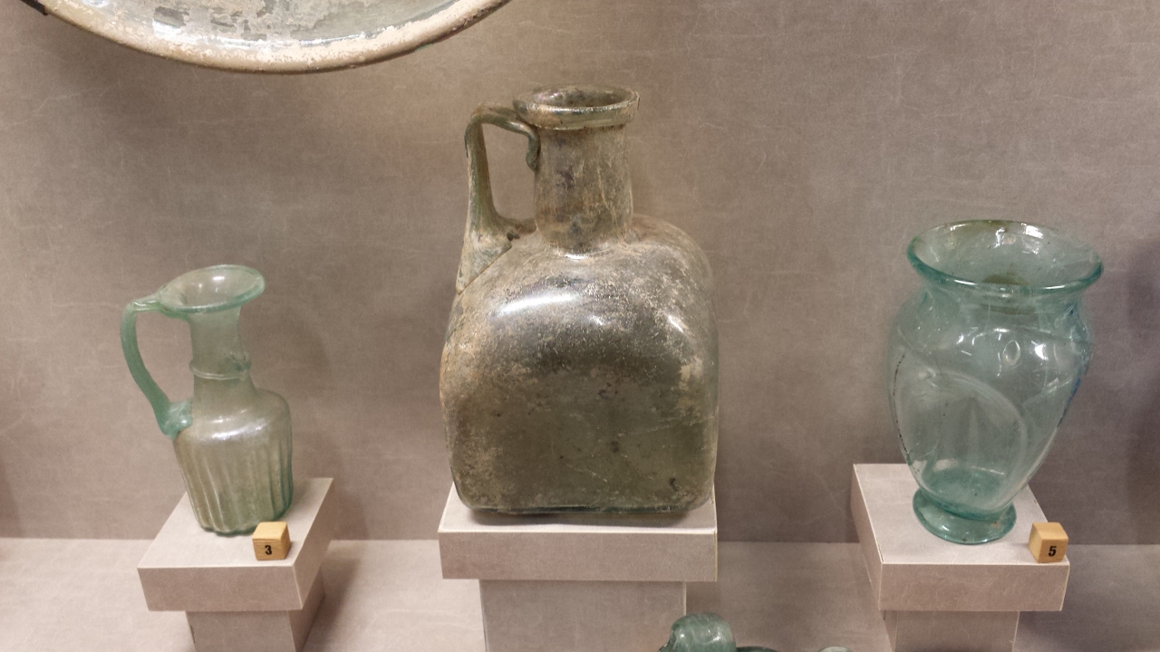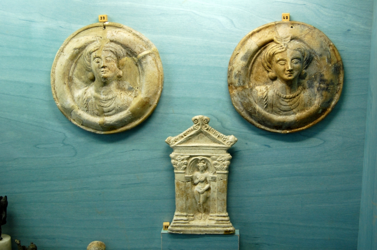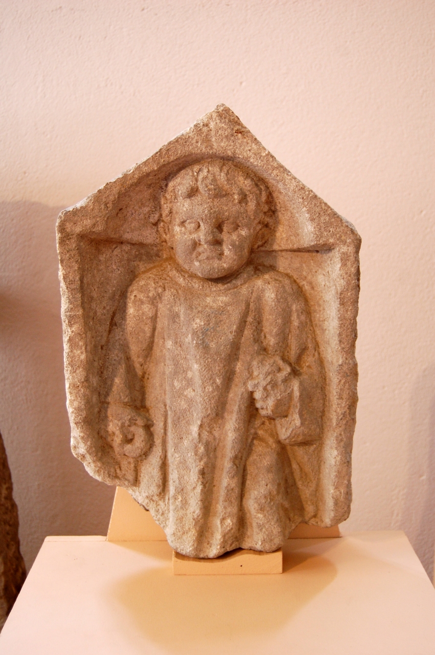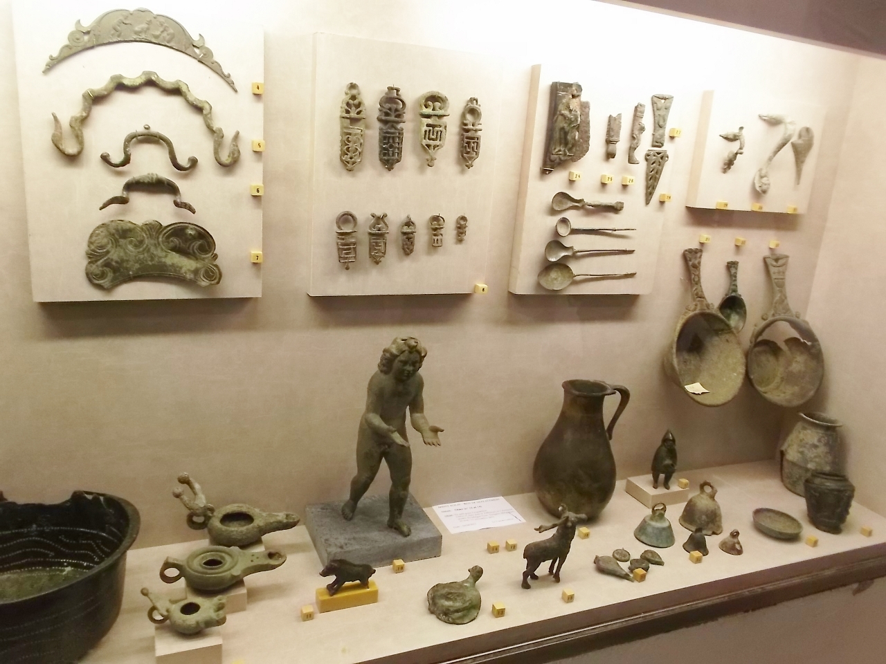guilles et des fuseaux ainsi que des pommeaux d’épée ; en bronze on a une quantité de petits objets tels que des statuettes de petits animaux ; en verre on a plusieurs ampoules qui servaient à conserver les parfums ou des condiments, on a également de la vaisselle avec notamment une bouteille en forme de poisson ; on a aussi quelques intailles, des objets en pâte de verre, des cachets de cire ; en céramique on a une grande quantité d’objets au nom de Pistillus, célèbre potier d’Augustodunum qui avait pour spécialité de signer ses moules : ses moules servant à produire en série des représentations de divinités pour les autels domestiques des populations les plus pauvres.