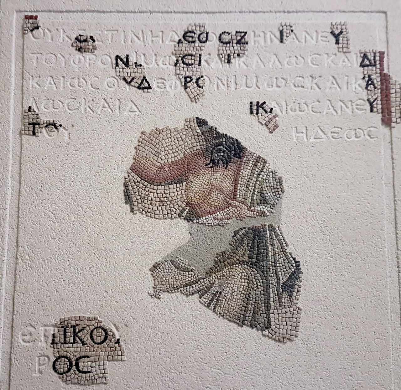 Dans la dernière salle de la partie antique a été installée auprès de pierres tombales en pierre (et un cercueil d’enfant en plomb), la mosaïque dite de Bellérophon qui impressionne par ses dimensions et son état de conservation. A elle seule elle témoigne de la richesse et de l’opulence de la ville à cette époque, sa qualité est telle qu’à trois mètres de distance les tessères de la mosaïque disparaissent à l’œil et donnent une parfaite illusion de réalisme.