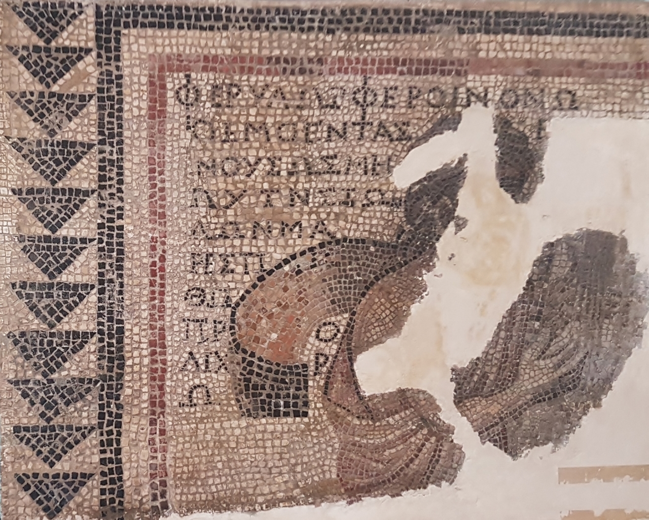 Dans le couloir qui suit on a des morceaux de la mosaïque de Neptune, dont reste surtout un « griffon marin », juste en dessous figure un joli dallage en marbres rose, vert et blanc.