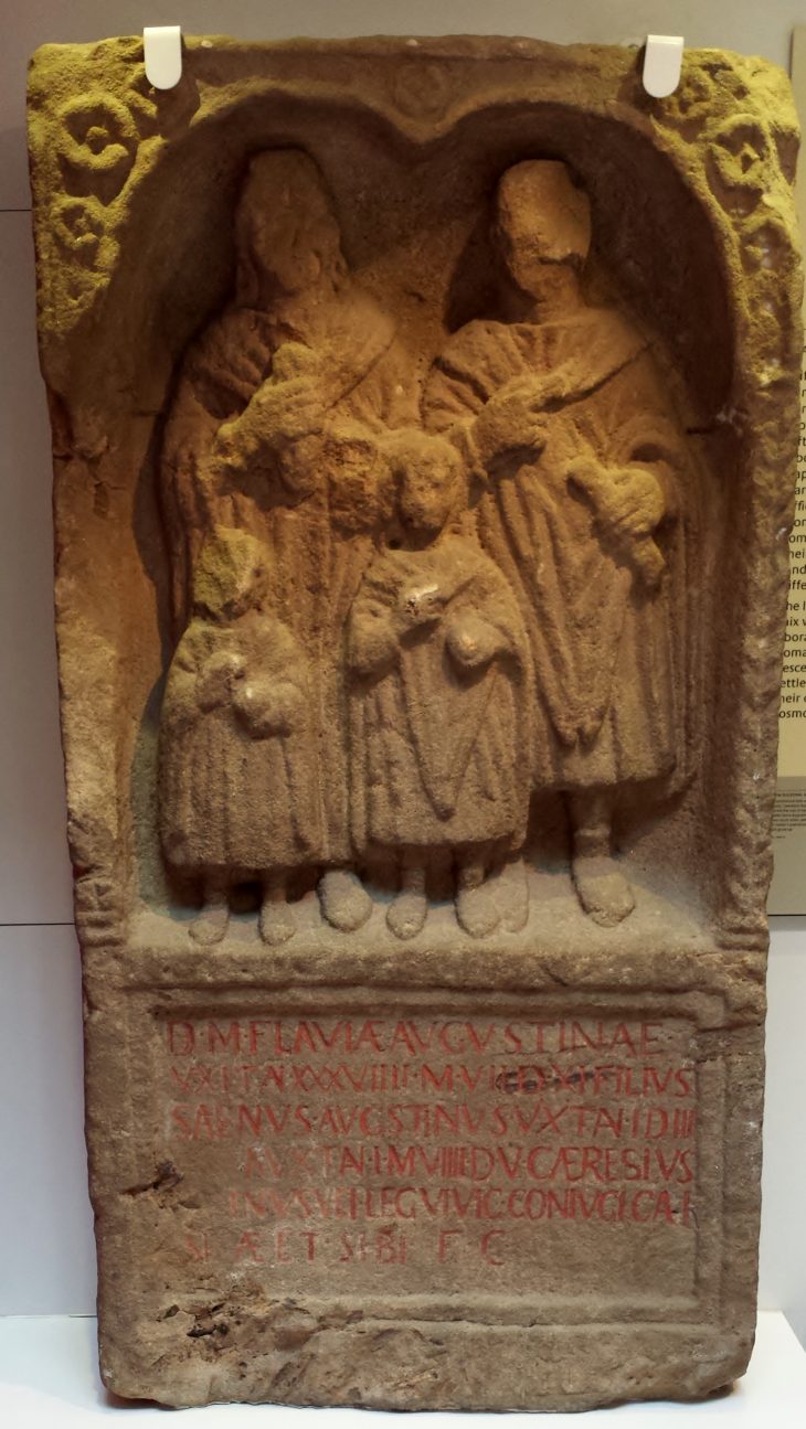 - D(is) M(anibus) Flaviae Augustinae vixit an(nos) XXXVIIII m(enses) VII d(ies) XI filius Saenius Aug(u)stinus vixit an(num) I d(ies) III […]a vixit an(num) I m(enses) VIIII d(ies) V G(aius) Aeresius Saenus vet(eranus) leg(ionis) VI Vic(tricis) coniugi cari- [s]simae et sibi f(aciendum) c(uravit)