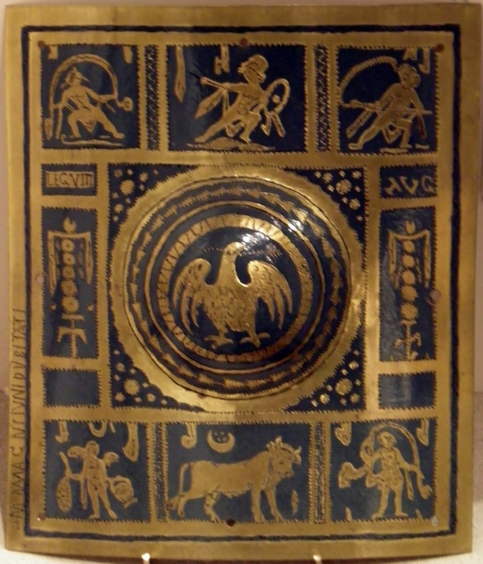 - Réplique d’un umbo dont l’original a été retrouvé à l’embouchure de la rivière Tyne (probablement suite à un naufrage) en 1867 et est exposé maintenant au British Museum à Londres. Cette pièce de bouclier a appartenu à Lunius Dubitatis légionnaire de la Legion VIII Augusta dont le nom est poinçonné sur le côté.