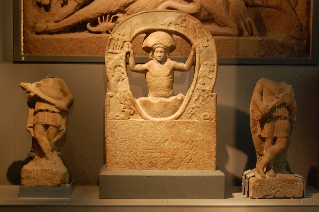 - Relief en pierre de Housesteads représentant Mithra sortant d’un œuf et brandissant une épée et la torche. Il est entouré par les signes du zodiaque (de gauche à en bas à gauche: Verseau, Poissons, Bélier, Taureau, Gémeaux, Cancer, Lion, Balance, Scorpion, Sagittaire, Capricorne)
