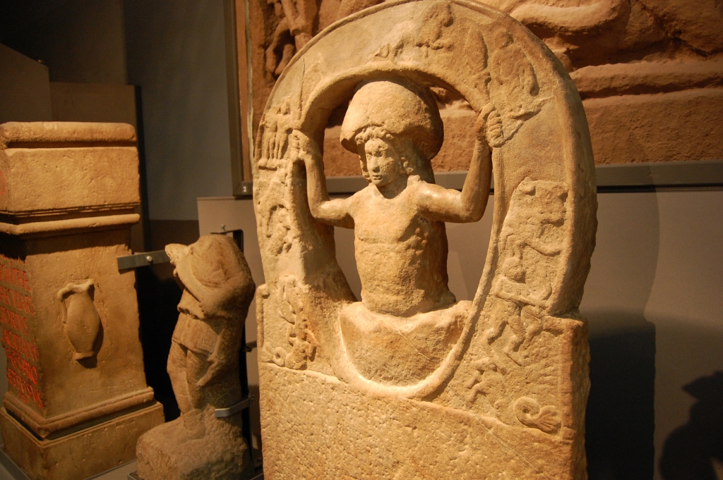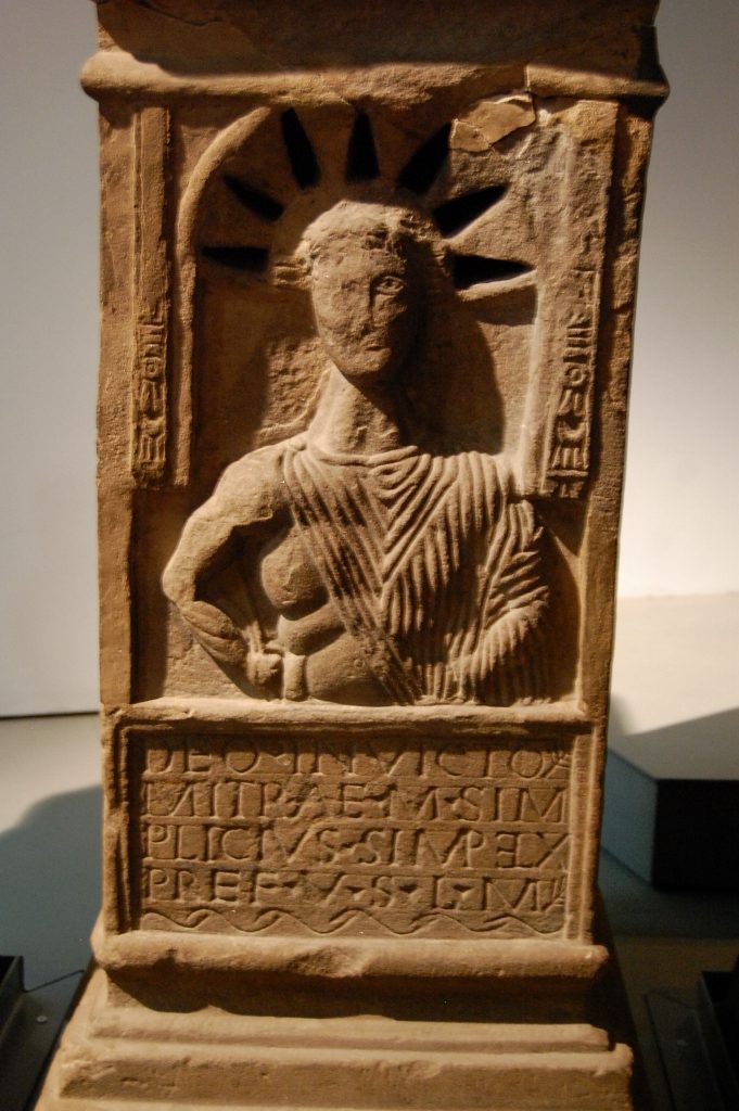 - Autel à Mithra mis en place dans le mithraeum au Carrawburgh. La couronne rayonnante autour de la tête de Mithra est percée pour permettre à la lumière d’une lampe ou d’une bougie placée à l’intérieur de briller à travers et d’obtenir un effet scénographique grandiose. L’inscription (RIB 1546) Deo Invicto Mit(h)rae M(arcus) Sim / plicius Simplex / pr(a)ef(ectus) v(otum) s(olvit) l(ibens) m(erito) « Au Dieu invaincu Mithra, Marcus Simplicius Simplex, préfet, s’est acquitté de son vœu de bon gré »