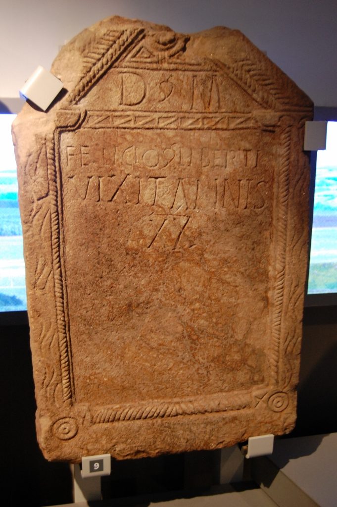 - D. M. FELIOTO LIBERTI VIXIT ANNIS XX. – stèle dédiée aux Mânes de Felicio, affranchi. Il a vécu vingt ans.