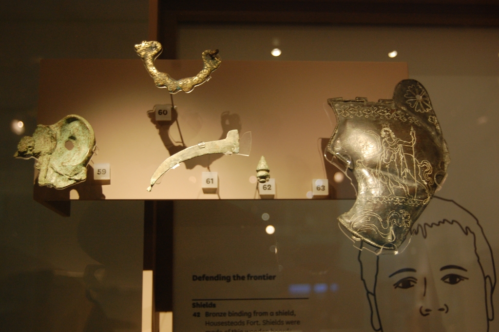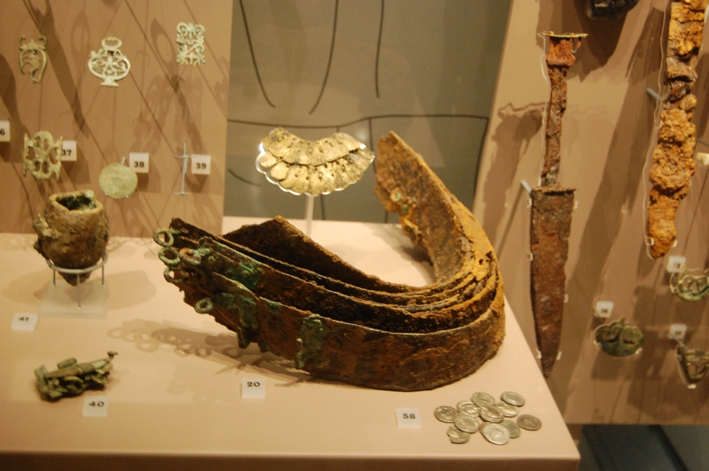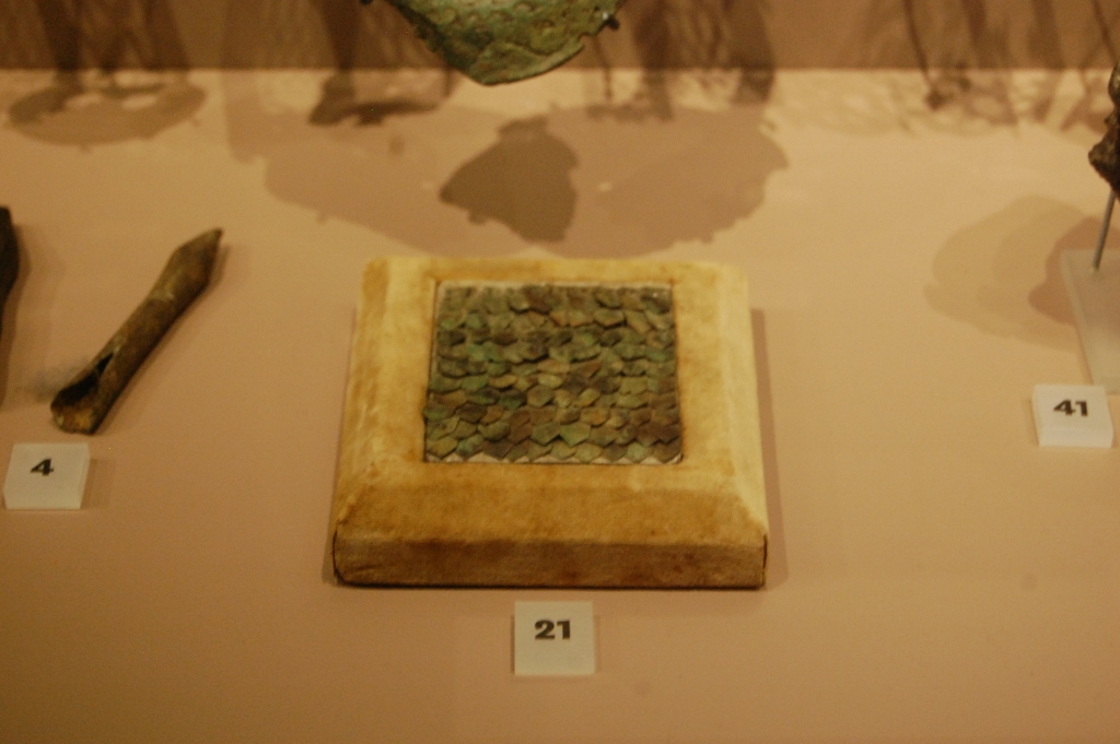 - Pièces d’équipements militaire – au centre, morceau d’une Lorica squamata (cotte d’écaille)