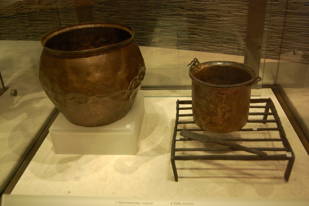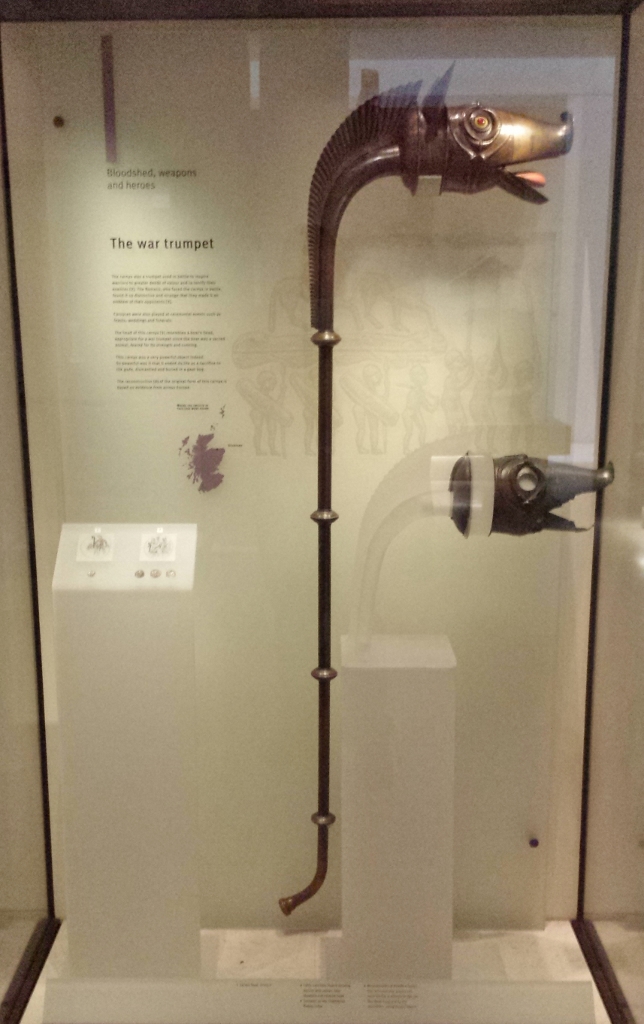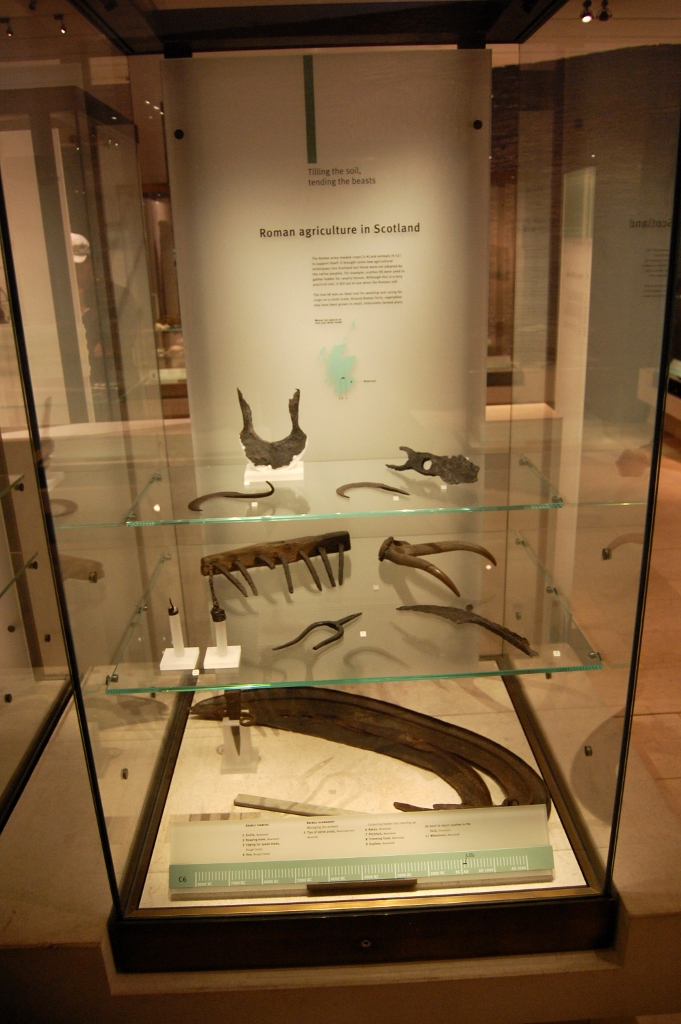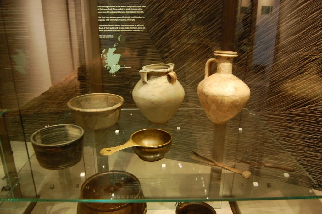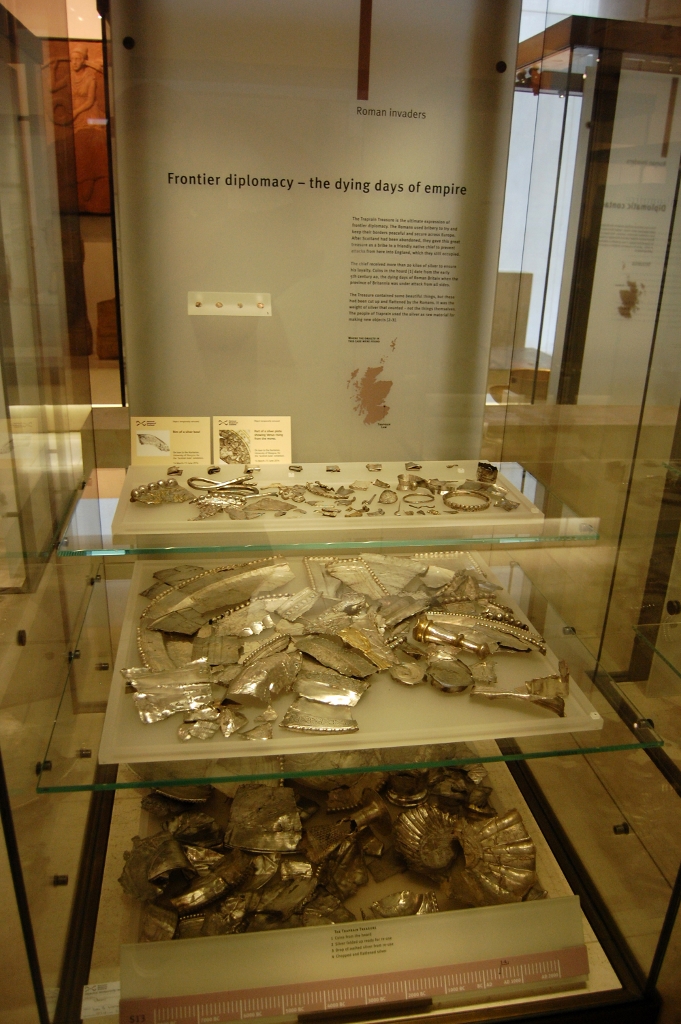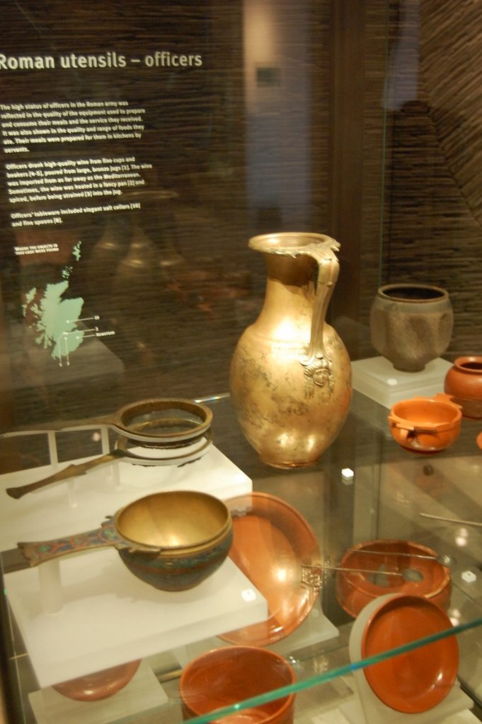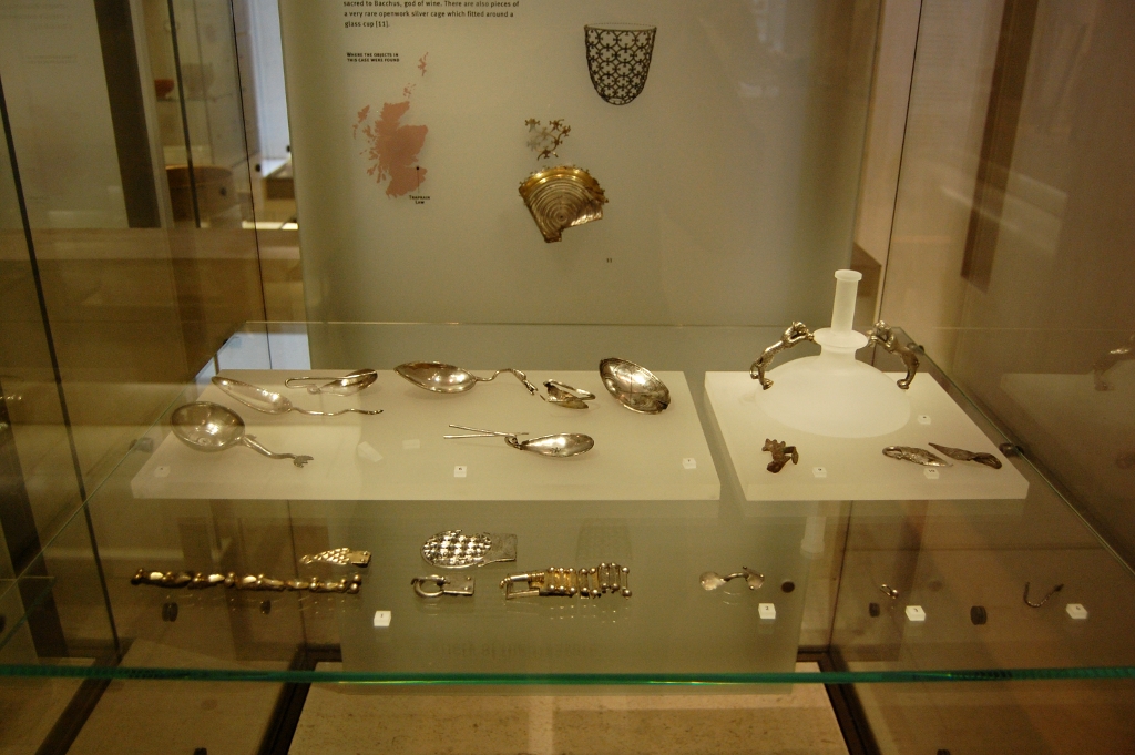 D’une vitrine à une autre se côtoient également de très belles pièces comme des roues en bois de chariot parfaitement conservées, des éléments de lit sans oublier un superbe trésor d’argenterie : le Traprain Law treasure. Celui-ci date du Ve siècle et comprend plus de 250 pièces d’argenterie. Mis au jour en 1919, cet ensemble a visiblement été enterré autour de l’année 425 ap. J.-C. Ces objets, dont une partie correspond à de la vaisselle de table, sont ornés de décors très fin où se côtoient l’iconographie gréco-romaine païenne et l’iconographie chrétienne précoce. Il est probable que ce trésor soit le résultat d’un cadeau diplomatique ou d’un paiement à des mercenaires en échange d’une protection contre les intrusions des Pictes, Scots et Angles. Quoiqu’il en soit, cet ensemble exceptionnel témoigne du savoir-faire des orfèvres de l’Antiquité.