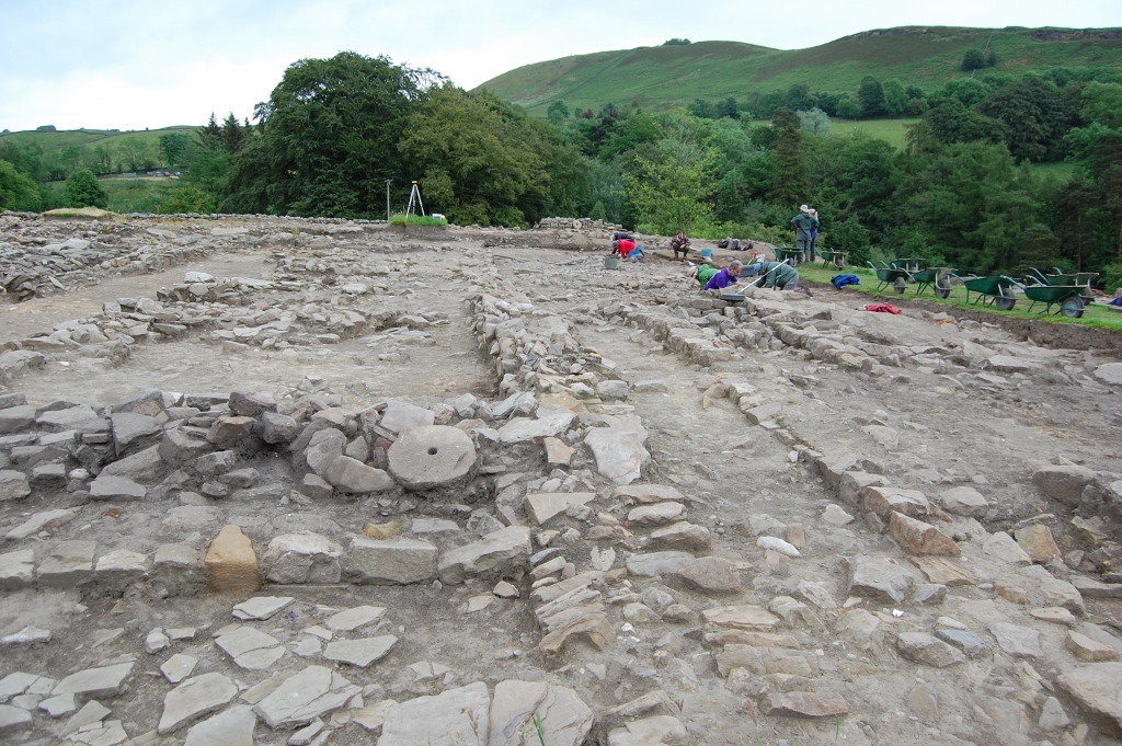 - Équipe d’archéologues fouillant le Vicus de Vindolanda, avec en fond les reconstructions de fortification.
