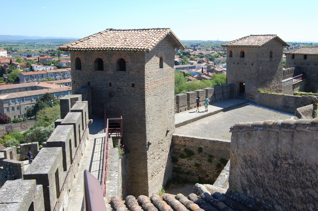 - vue intérieur du rempart romain de la cité de Carcassonne et des tours en fer à cheval